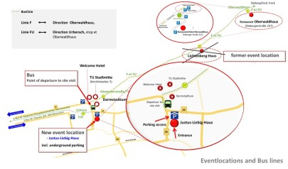From Darmstadt city center (Luisenplatz) to the conference venue we recommend to use bus line F or F/U. For the rest of the journey, please see „arrival by public transport“.